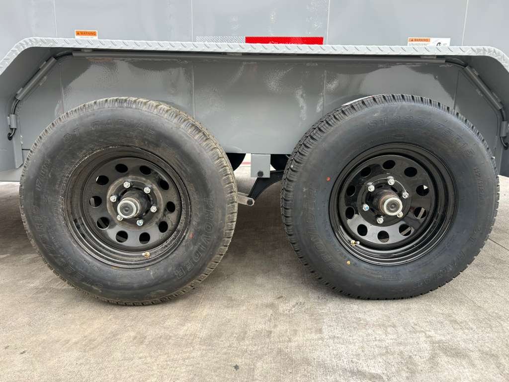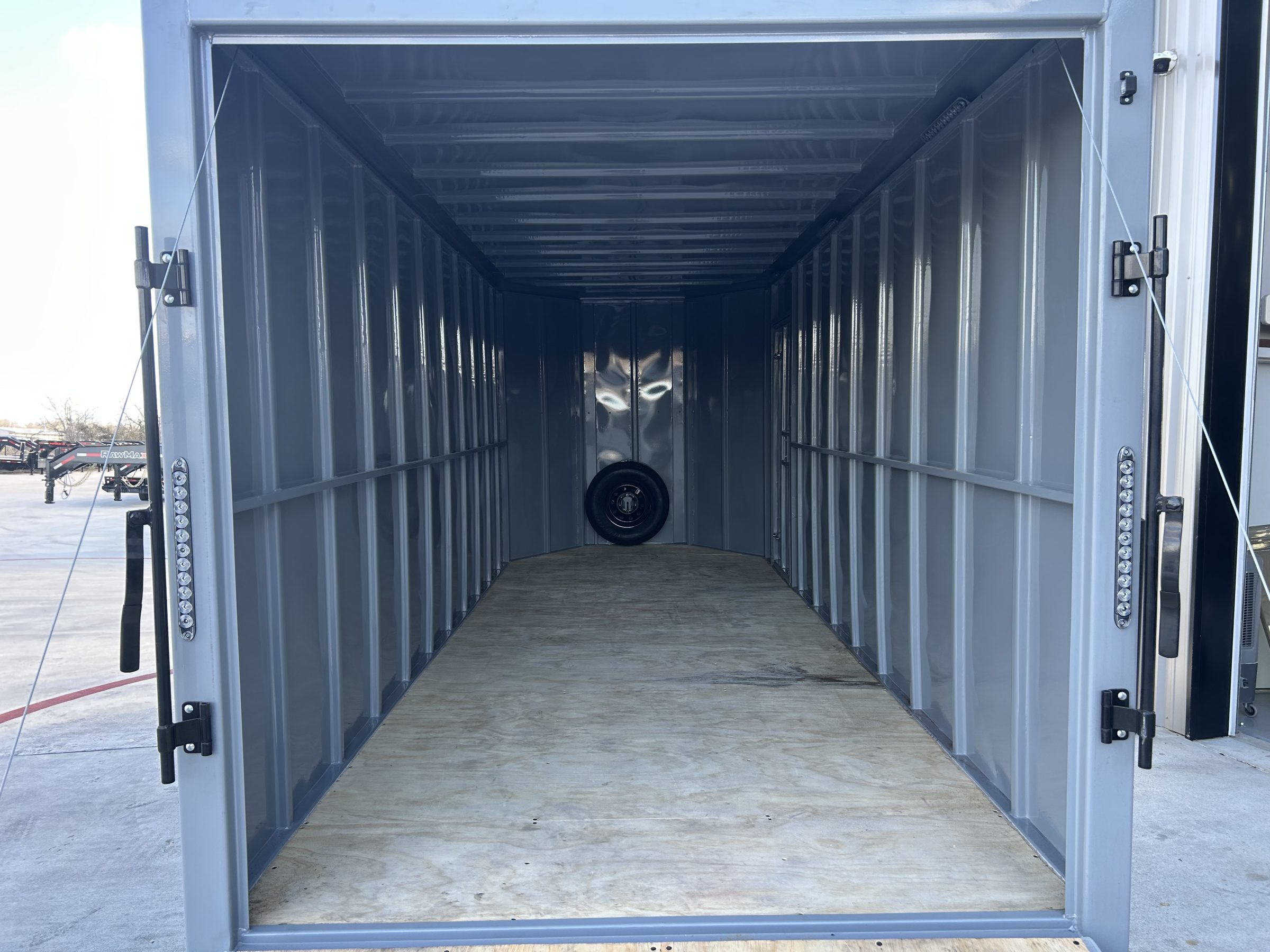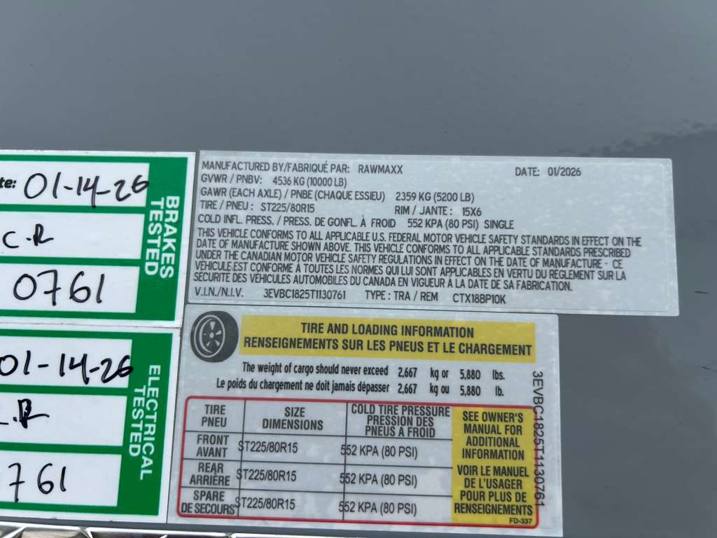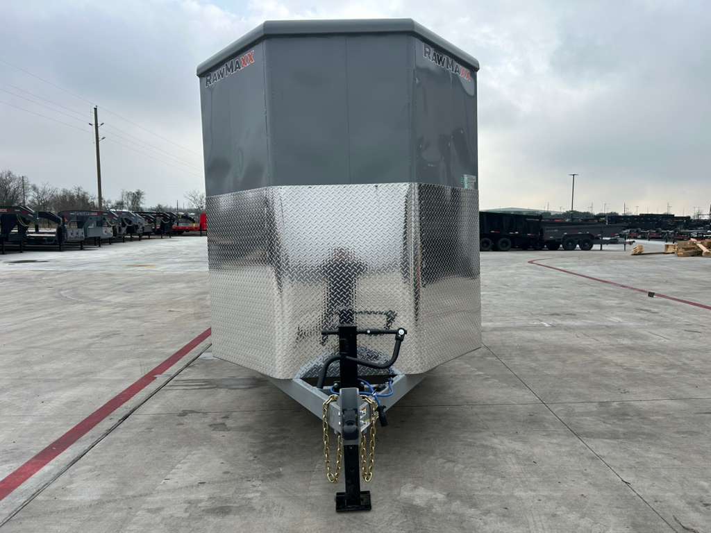 2026 RWMX 18×7 Enclosed 2 5/16” Ball Adjustable Coupler Frame: 2″ x 3″ x 11G Tubing2″ x 5″ 3/16″ Tongue Cross-Members: 1.5″ x 1.5″ Tubing / 16″ OC16G Steel Sheet Sides12G Tread plate Steel Fenders16G V-Nose Front Guard: 18G Aluminum Thread plate Spare Tire Mount: Located Inside Nose16G Steel Plate Roof3/4″ Plywood Flooring32″ Passenger Side Door with Cam-Over Latch Rear Ramp Door with Cam-Over Latch1 Side Wind Drop Leg Jack – 7,000 lbs4 – 8 Ply ST225/75R15 Tires and Spare Spring Suspension2 – 5,200 lbs Axles With Brakes5/16″ G70 Safety Chains3M DOT Compliant Reflective Tape All Weather Wiring Harness Powder Coat Paint