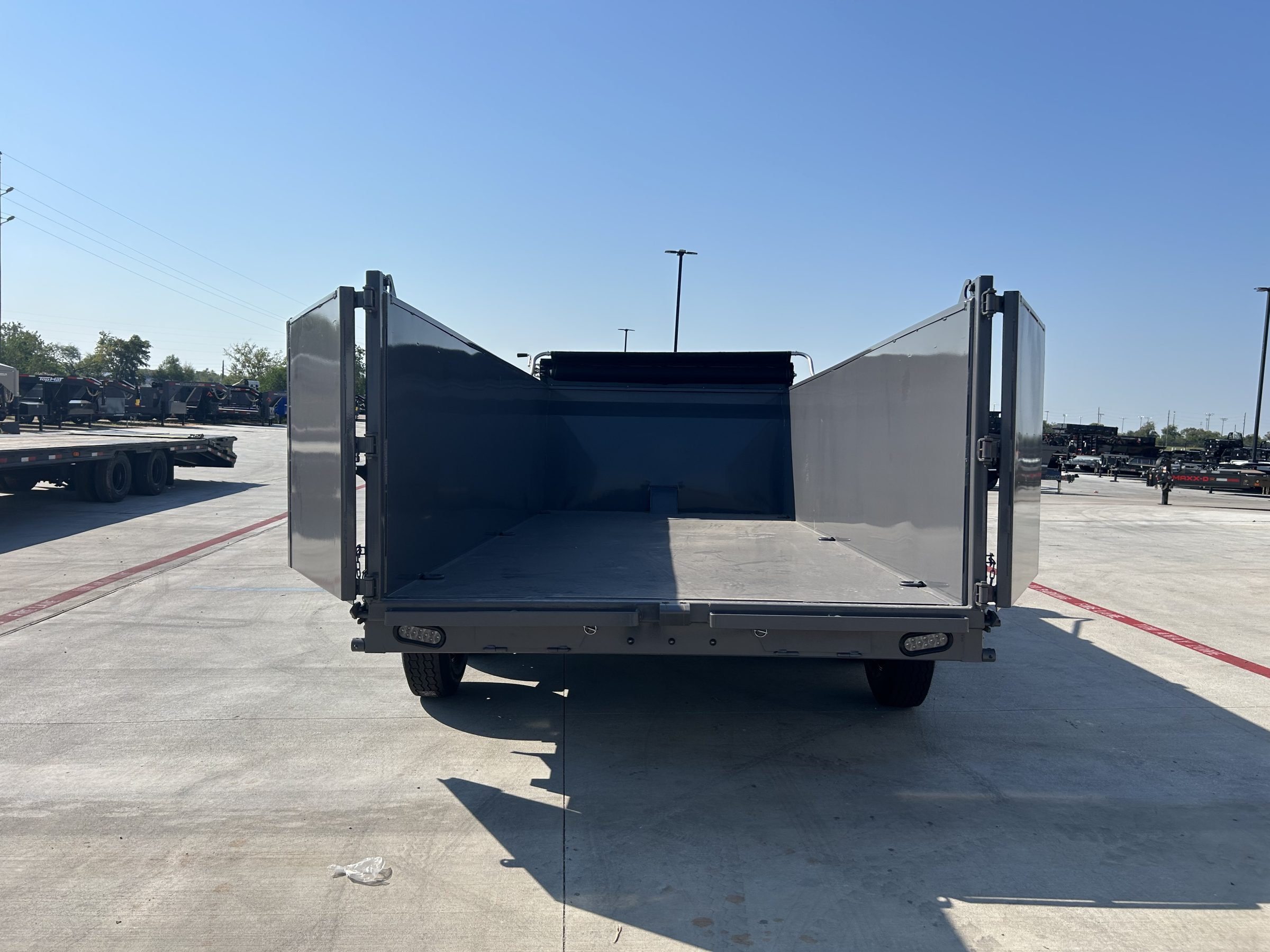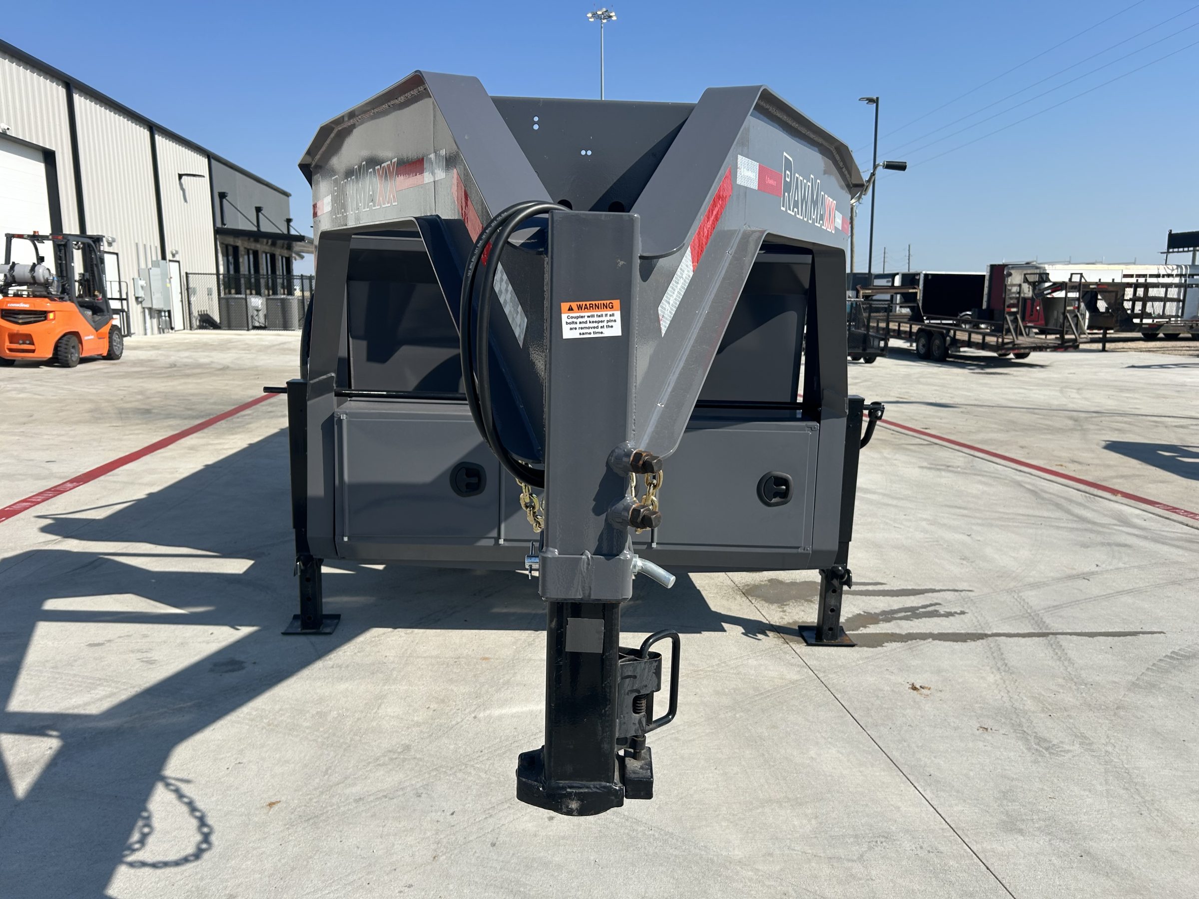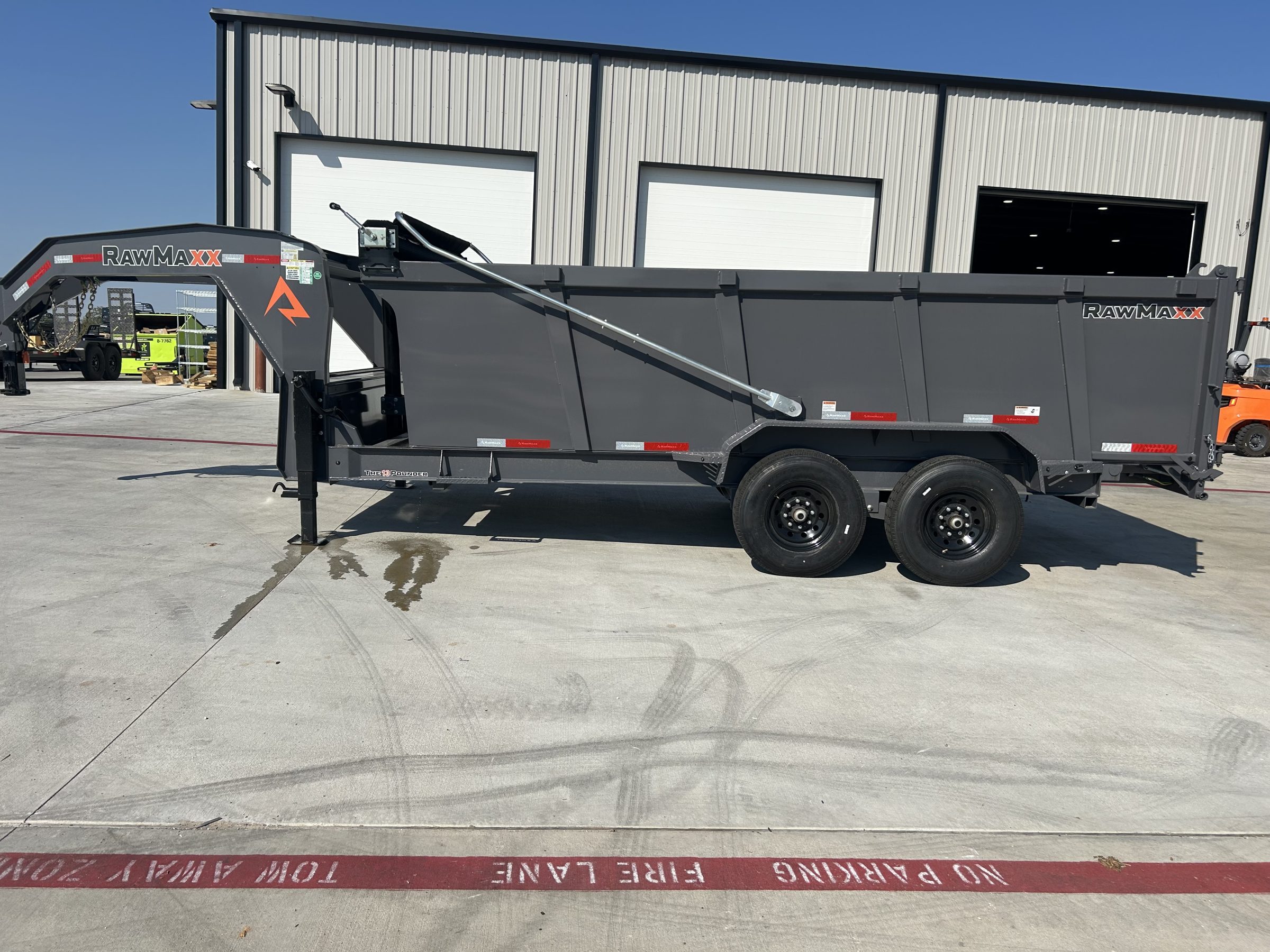 2026 RWMX 16×83 GN Dump 2-5/16” Ball 25,000 lbs Square Coupler 8″ x 13 lbs I Beam Frame 3″ Channel / 16″ OC 2 Side Wind Drop Leg Jacks – 10,000 lbs Inside Width: 83″ – Side Height: 44″ 10G Formed Walls – Grade 50 8G Steel Floor 12G Thread Plate Steel Fenders 3-7/8″ x 1-13/16″ (ID) Stake Pockets 4 D-Rings (Welded Inside Corners) 3 Way Doors 6′ Slide-In Channel Ramps Front Tool Box: Between Risers Grade 50, One-Piece Gooseneck Hydraulic – Power Up – Down 144″ Cylinder on 16′ Manual Flip over Tarp 5 – 14 Ply ST235/80R16 Tires Spring Suspension 2 – 7,000 lbs Axles With Brakes 3/8″ G70 Safety Chains 3M DOT Compliant Reflective Tape All Weather Wiring Harness Powder Coat Paint